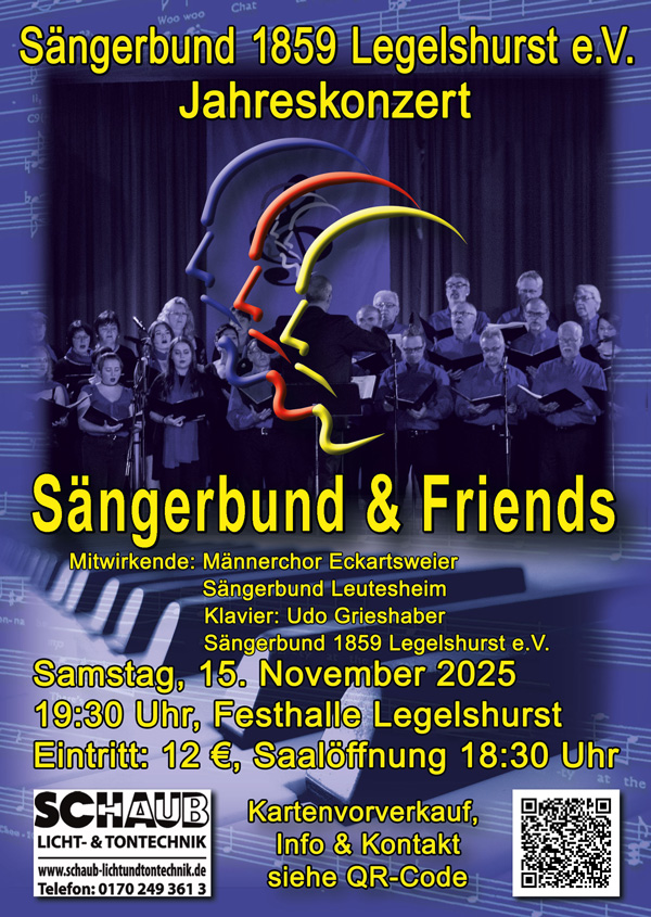 Am Samstag, dem 15. November um 19:30 Uhr findet das Jahreskonzert des Sängerbund Legelshurst statt.