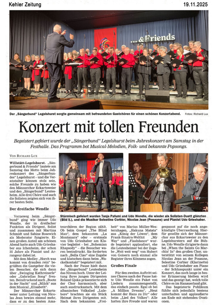 Jahreskonzert „Sängerbund and Friends“ am 15. November 2025 um 19:30 Uhr in der Festhalle Legelshurst