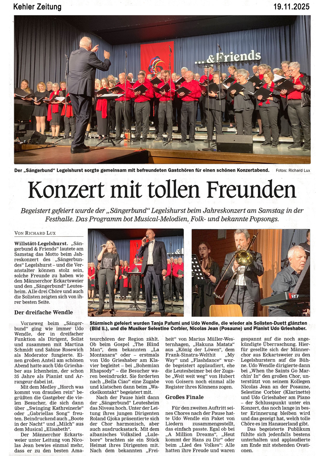 Zur Unterstützung mit dabei sind der befreundete Männerchor MGV Schutterbund Schuttertal, einige choreigene Solisten, sowie unsere Live-Begleit-Band, die „Scheibenwischer-Combo“ aus Ichenheim, unter der Leitung von Udo Grieshaber.